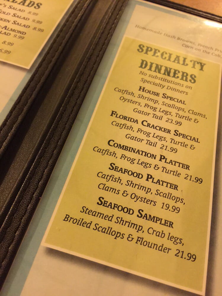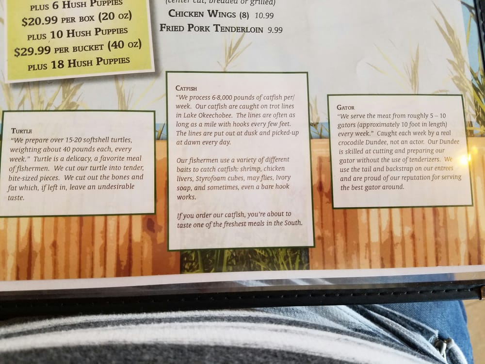 Catfish, shrimp, scallops, clams, oysters, frog legs, & gator tail